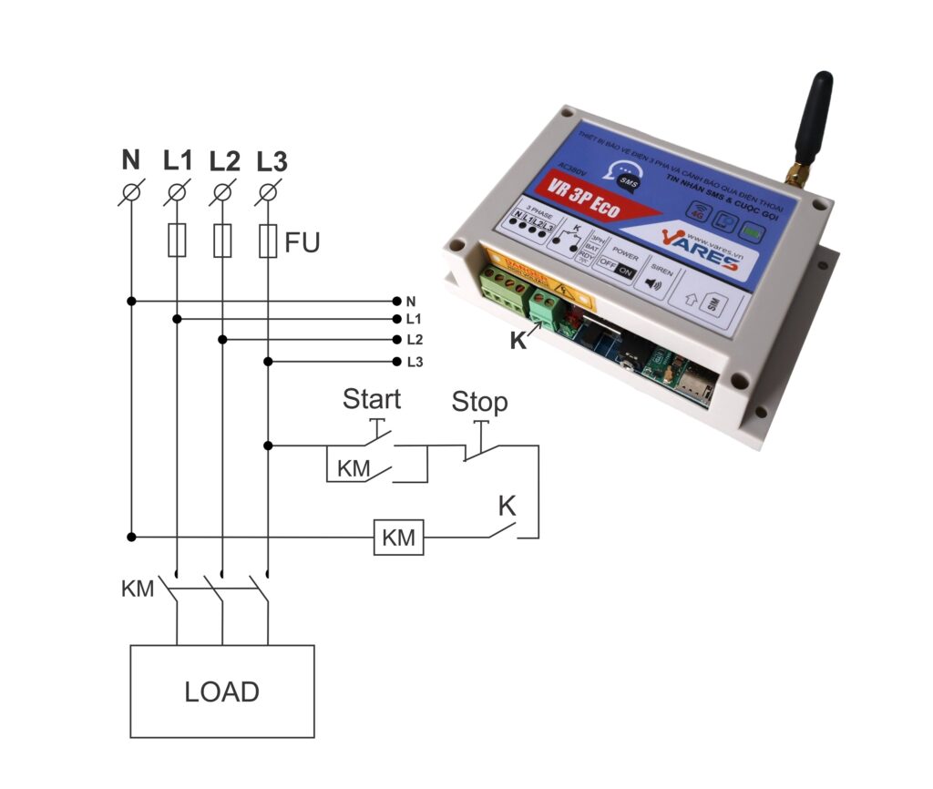 Thiết bị có chức năng bảo vệ khi có sự cố điện 3 pha (Mất pha/Sai pha) bằng 1 ngõ ra Relay 2A. Người dùng có thể bảo vệ tải 3 pha bằng cách dùng ngõ ra này để kích Contactor (Khởi động từ) Tổng, hoặc ngắt CB Tổng (gắn Shunt Trip) khi có sự cố điện 3 pha, từ đó bảo vệ các tải 3 pha phía sau tủ điện tổng.